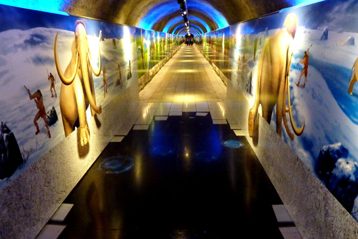 洞くつに続くトンネルには、長い年月をかけて形成された秋吉台や秋芳洞の歴史がイラストで描かれてます。かつて生息していた恐竜や、今にも飛び出してきそうなマンモスのトリックアートも必見です!