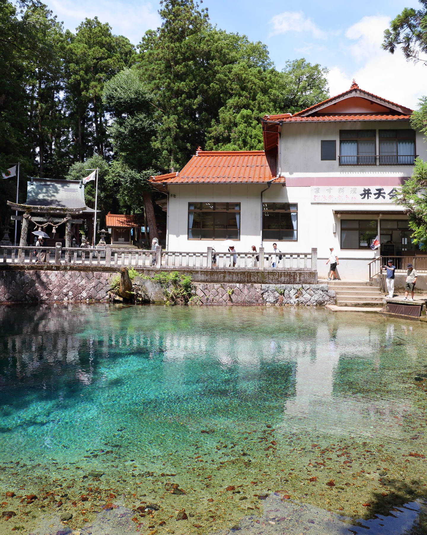 日本名水百選に選ばれた人気のパワースポット。光の性質や水の中に溶けるミネラルの作用で水面がエメラルドグリーンに輝きます