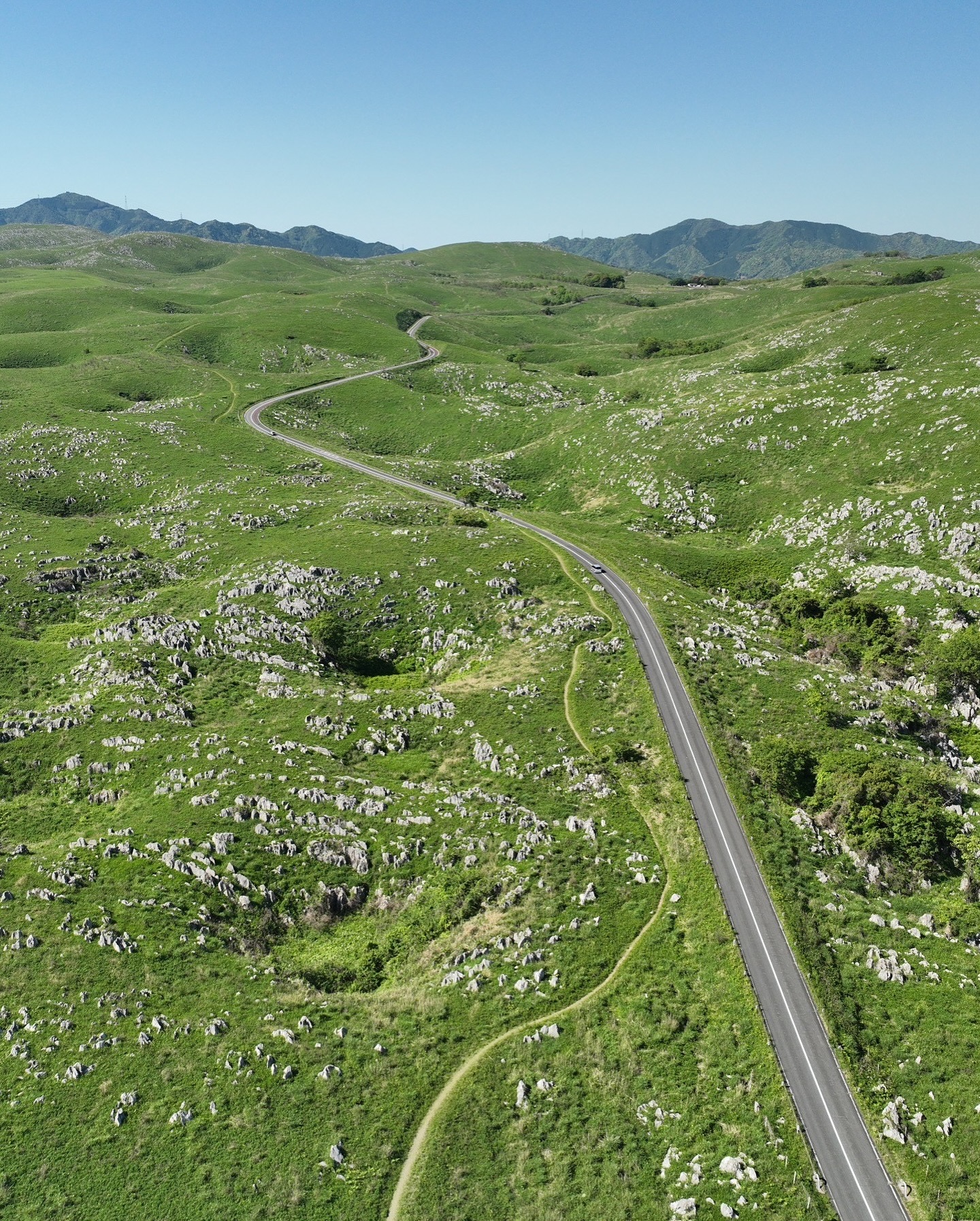 日本最大級のカルスト台地。白い石灰岩が点在する独特のダイナミックな風景は圧巻。「カルストロード」をドライブすれば、四季ごとに変わる絶景を楽しめます