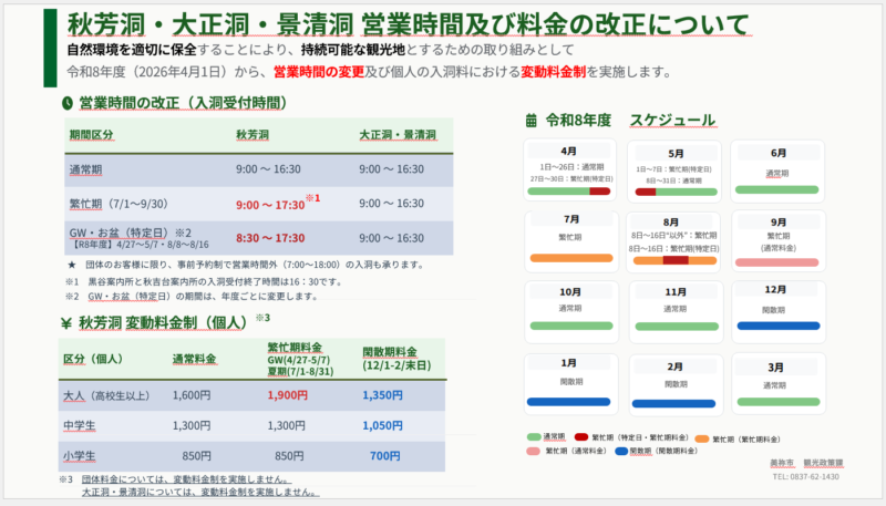 令和8年4月から秋芳洞及び大正洞・景清洞の営業時間及び観覧料を改定します。 自然環境を適切に保全することにより、持続可能な観光地とするための取り組みとして、 令和8年度(2026年4月1日)から、営業時間の変更及び個人の入洞料における変動料金制を実施します。 皆様には御迷惑をおかけいたしますが、御理解、御協力をいただきますようお願い申し上げます。
