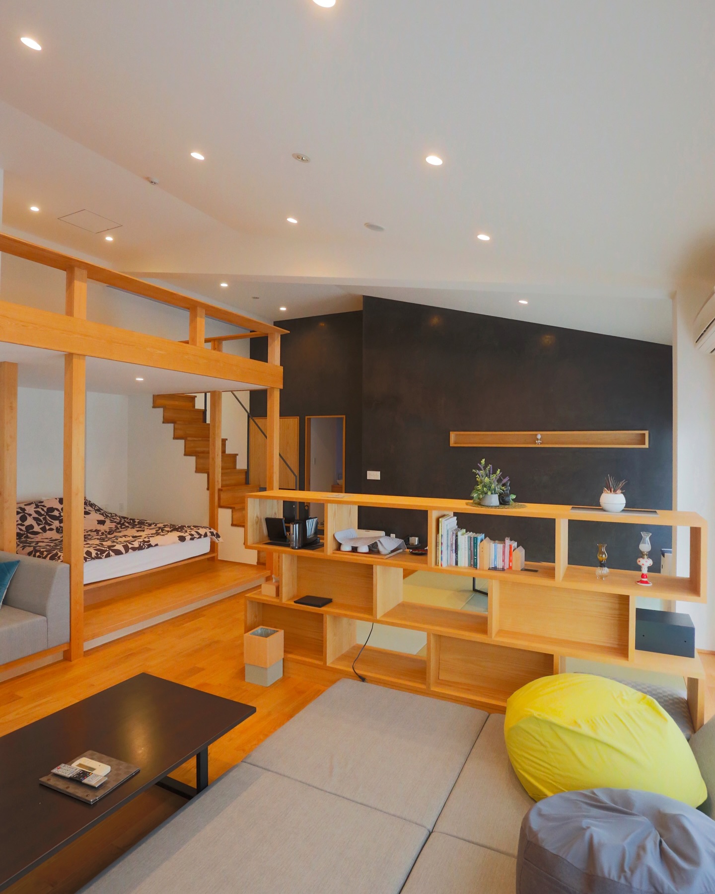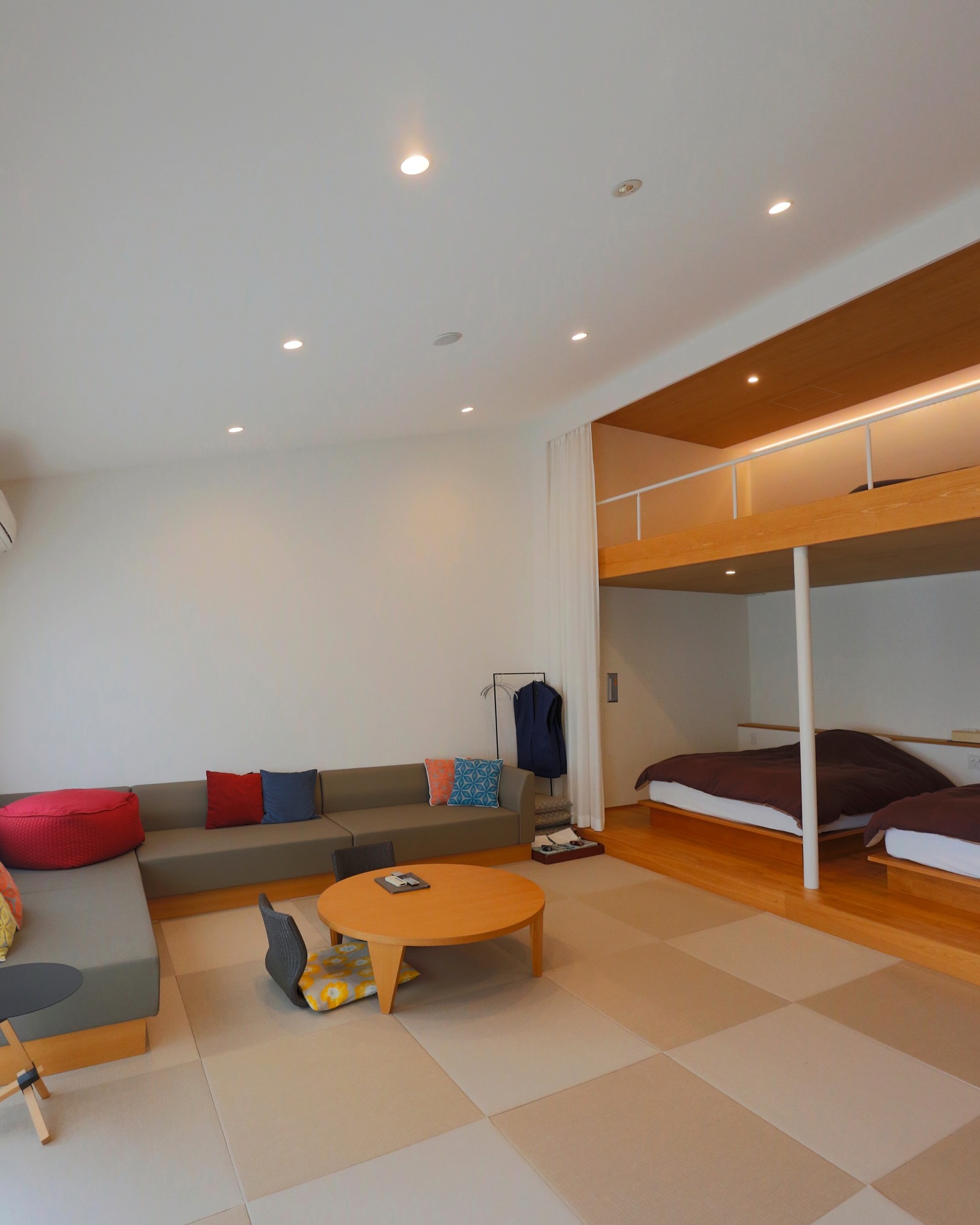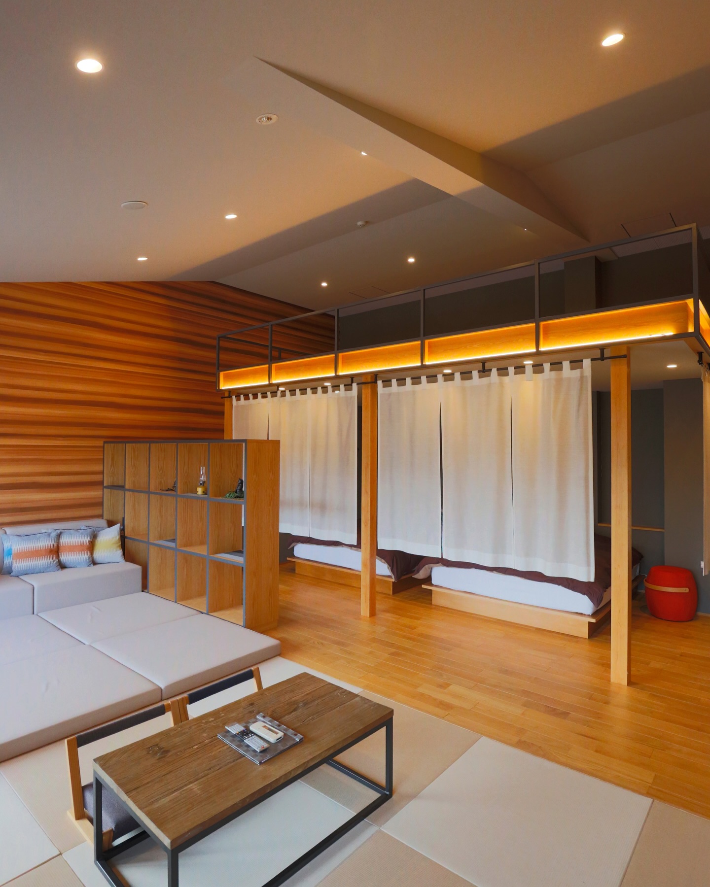 お部屋は、それぞれ異なるコンセプトでデザインされていて、和の趣を感じる木の壁と暖簾が印象的なお部屋や、白を基調にした広々とした空間に L 字ソファーや丸テーブルのあるお部屋など好みに合わせて選べます♪